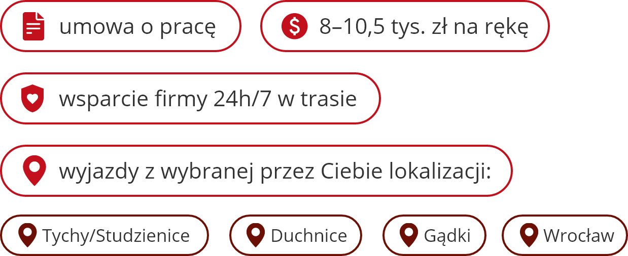 miesięczne wynagrodzenie w przedziale 8 000-10 500 zł na rękę, wypłacane w całości na konto kierowcy,